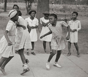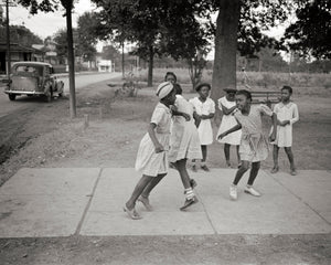 Step into the carefree world of Lafayette, Louisiana in 1938 with this delightful photograph captured by Russell Lee. It showcases a heartwarming scene of girls playing on the sidewalk, embracing the innocence and joy of childhood.