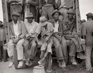 Migrant workers waiting to get paid sitting on the back of a truck. Taken in 1939, Homestead, Florida.