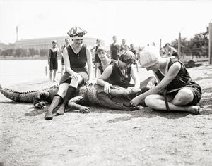 Delve into the intriguing mysteries of the past with this photograph taken in the early 1920s at Washington DC's Tidal Basin. In this whimsical and slightly perplexing image, two girls boldly pose for a photo while sitting atop an alligator or crocodile while another examines its mouth. The origins of this unexpected visitor remain shrouded in curiosity. Was it a real creature, or perhaps a cleverly crafted prop? The unanswered questions only add to the quirky and fun nature of this photograph, leaving room for speculation and imagination. Take a step back in time and let this captivating image spark your curiosity, inviting you to ponder the stories and peculiarities of days gone by.