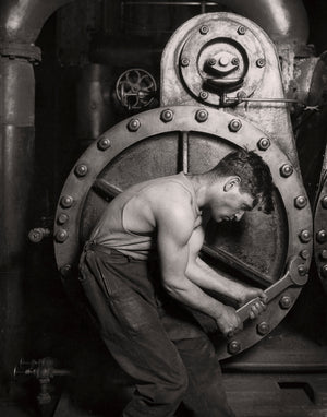 Lewis Hine's 1920 Power house mechanic working on steam pump, one of his "work portraits", shows a working class American in an industrial setting. The carefully posed subject, a young man with wrench in hand, is hunched over, surrounded by the machinery that defines his job. But while constrained by the machinery (almost a metal womb), the man is straining against it—muscles taut, with a determined look—in an iconic representation of masculinity.