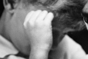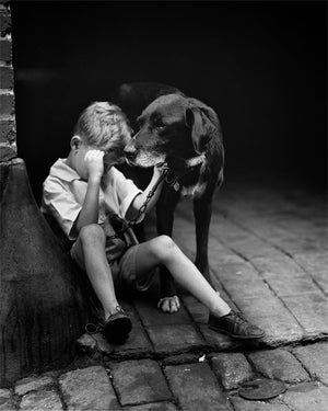 It is a personal and intimate scene frozen in time, where the emotional connection between the boy and his canine companion is palpable. The expressions on their faces evoke a sense of shared concern and empathy, forging a bond that transcends words. This photograph invites you to reflect on the bonds of friendship and the enduring love shared between a young boy and his devoted dog.