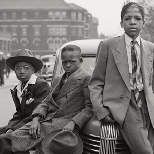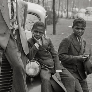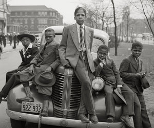 Transport yourself to the vibrant streets of South Side Chicago in 1941 through a captivating photograph by Russell Lee. This beloved remarkable image features a group of five African American boys perched on a car, capturing a snapshot of their youthful energy and camaraderie.