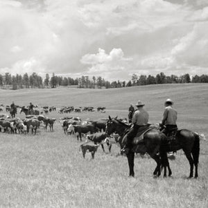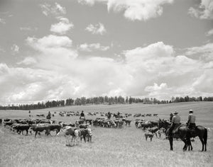 In this photo taken in 1939, we see a captivating scene of cowboys herding cattle under the expansive Montana sky. The vastness of the landscape contrasts with the ruggedness of the cowboys and the gentle presence of the cattle. The image captures the essence of the American West, depicting the timeless connection between humans and nature in this iconic setting.