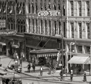 This vivid image shows Campus Martius, the Soldiers' and Sailors' Monument, Elks Monument, Wayne County Building, and Pontchartrain all in one Detroit view. The city is bustling with motor cars and a few horses. You can even get "Chop Suey"!