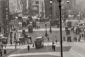 In this remarkable image, the streets come alive with activity as people traverse the sidewalks, peering into the stores that line the thoroughfare. The scene is a symphony of movement, where the old and the new coexist harmoniously. Horse carriages, trolleys, and the first automobiles share the road, symbolizing the transition into a modern era.