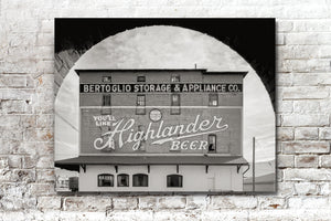 Adorning the building, a beautifully painted Highlander Beer sign catches the eye with its vibrant colors and nostalgic appeal. It evokes a sense of the past, harkening back to an era when such signs were a common sight in towns across America. Above it, the prominent signage of "Bertoglio Storage & Appliance Co" is painted in white with a black background..