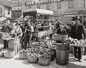 This remarkable photograph captures the early days of the original Indianapolis, Minnesota market in 1908. Witness the bustling scene as farmers proudly display their bountiful wooden baskets of freshly harvested vegetables, delivered by horse-drawn carts. This enduring market has stood the test of time and remains one of the five longest-running public markets in the United States. Celebrate the rich heritage of community, agriculture, and local commerce with this captivating image.