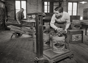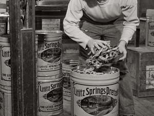The Lititz Springs Pretzel Company (pictured), while not as widely recognized as the Julius Sturgis Pretzel Bakery, is another part of the rich pretzel-making heritage of Lititz, Pennsylvania. Lititz Springs Pretzel Company was one of several smaller, local pretzel manufacturers that operated in the area, contributing to Lititz's reputation as a hub for pretzel production. Lewis C. Haines (background) is unloading a tray of pretzels that has come up on a dumb waiter from the baking room below. His son, Bob, weighs them and packs them in cans. Lititz was the first town in America where pretzels were made.