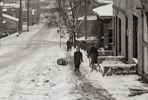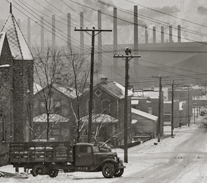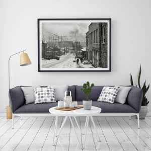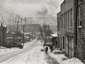 Step into a timeless American moment captured in 1941 by the renowned photographer Jack Delano. This evocative black-and-white photograph draws you into a winter scene taken in Midland PA - a quintessential mill town not too far from Pittsburgh. The towering steel mills dominate the background, their smokestacks billowing into the cold air, adding a layer of grit and grandeur to the everyday lives of the town's inhabitants.