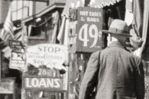 Time travel to 1939 with this photograph of Minneapolis. Explore the bustling Gateway District, where pawnshops and secondhand stores line the streets, offering a glimpse into the thrifty culture of the era.