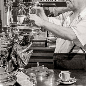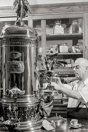 Photo of Manhattan New York, Italian-American cafe espresso shop on MacDougal Street where coffee and soft drinks are sold. Taken in 1942. This showcases the large traditional espresso machine made of brass.