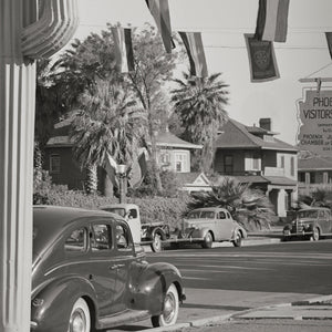 This vintage photo, taken in 1940 by photographer Russell Lee, showcases the streets of Phoenix, Arizona. The scene depicts a charming street adorned with distinctive cactus-shaped street lights, giving the area a unique southwestern flair. Flags hang gracefully from wires, gently swaying in the breeze, adding a touch of vibrancy to the street. A classic 1940s car is parked nearby, capturing the essence of the era.
