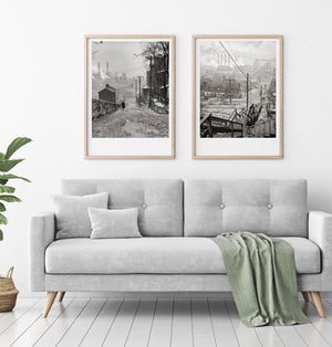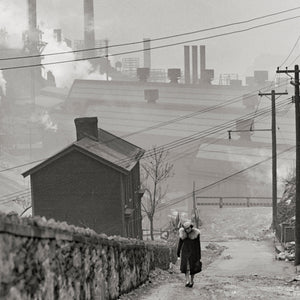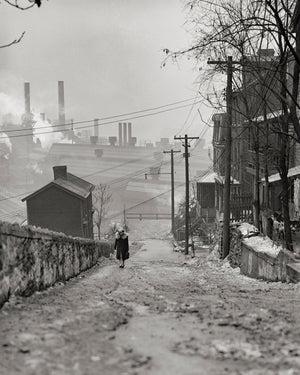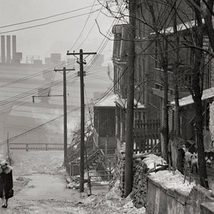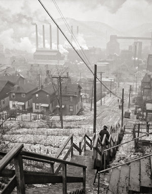 Explore the world of Pittsburgh mill workers through this unique photo collection. These two photographs depict the daily experiences of workers in the winter season. One image captures a worker ascending a hill, braving the cold as she is coming home from work. In the second photo, another worker descends steep stairs, for his shift. The contrasting scenes illustrate the demanding nature of their jobs. These powerful images offer a glimpse into the lives of these hardworking individuals, showcasing their determination in making a living in the 1940s.