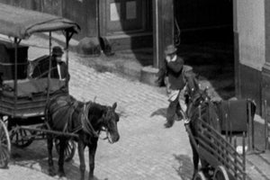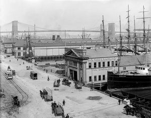 New York City South Street Piers photo of a city still growing. Horse and buggies with passage to Baltimore. You can see the Brooklyn Bridge is in the background.