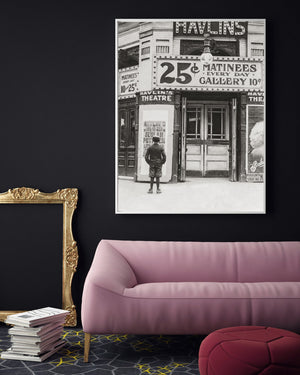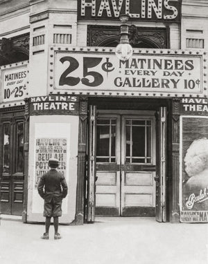 Go back to the early days of cinema with this charming vintage photograph. Captured in 1910 on Sixth Street in St. Louis, Missouri, the image features a young boy gazing at the captivating movie posters of Havlin's Theater. Step into the past and feel the excitement of the movies, where matinee tickets were priced at an affordable 25 cents. This unique piece of history captures the magic of early cinema and serves as a delightful addition to any collection.