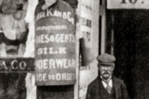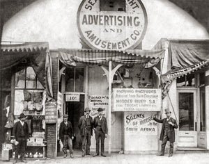 Within the captivating frame, you'll also notice the presence of four men standing outside the moving pictures, possibly engaging in animated discussions or eagerly anticipating the forthcoming entertainment. Adding a touch of novelty, another individual is depicted selling silk underwear—a unique detail that reflects the diverse nature of commerce during that time.