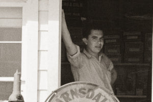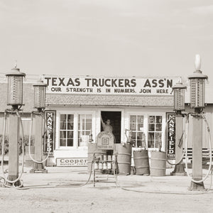 This image offers a glimpse into Edcouch Texas in 1939 at a gas station where an attendant stands in the shaded doorway, his arm raised agains the door. The vintage signage adds to the charm, with one prominently displaying the message, "Texas Truckers Ass'n Our Strength Is In Numbers, Join Here," a testament to the importance of unity among truckers in the region.