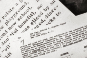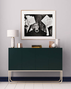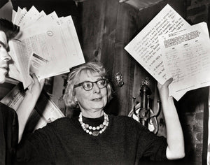 This portrait of Jane Jacobs, Chairman of the Commission to save the West Village, holds up documentary evidence at a press conference at Lions Head Restaurant at Hudson & Charles Streets.