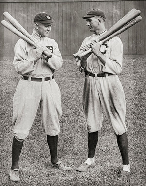 Step into the golden era of baseball with a photograph taken in 1913. Here, two legendary figures, Ty Cobb of the Detroit Tigers and Joe Jackson "Shoeless Joe", of the Cleveland Naps, stand side by side, their presence commanding attention. Each player grasps two bats in their hands.