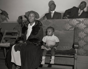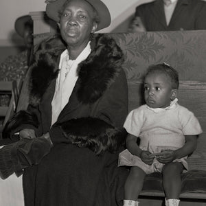 In this poignant photograph by renowned photographer Gordon Parks, captured in 1942, a young girl and her grandmother attend church at the Deacons' corner in the Church of God in Christ in Washington, D.C. The grandmother meets the camera's gaze with a solemn expression, while the young girl, her feet dangling from the pew, directs her curious gaze towards her right. This intimate moment within the sacred space of the church reflects the intergenerational bond and contemplation of faith, inviting viewers to reflect upon their own spiritual connections and the experiences of youth and wisdom.