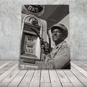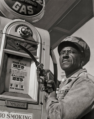 In this remarkable photograph taken by Gordon Parks in 1942, we see a mechanic at an old gas station focused on his task. Mr. Parks, known for his evocative portraits, skillfully captures the essence of the moment. The man is depicted holding the gas nozzle, his gaze directed toward the distance, adding a sense of contemplation to the scene. The image invites us to reflect on the timeless atmosphere of this vintage gas station, and what the attendant is looking at and thinking about.