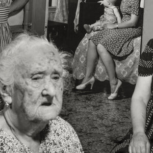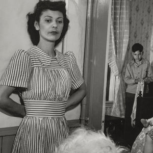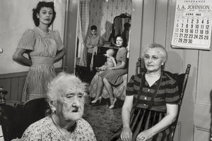 In this masterfully composed photograph by Gordon Parks, taken in Gloucester, MA in 1943, we witness a poignant portrayal of four generations within a Portuguese family. The scene unfolds in the front room, where three women are positioned, with two seated and one leaning against the wall. The eldest woman takes center stage in the foreground, commanding our attention. Through the open door at the back, we catch a glimpse of a mother with her young boy and a baby, providing a tender glimpse into the familial bonds that transcend generations. The photo captures a timeless moment, inviting us to reflect on the rich tapestry of family and heritage.