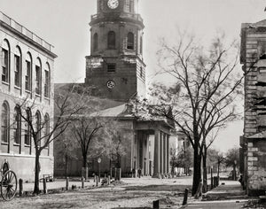A poignant relic of history is this rare photograph capturing the East Saint Michael's Church in Charleston, South Carolina, in 1862. This early image showcases the devastating impact of the Civil War, immortalizing the scene of destruction. Experience a glimpse into the turbulent times as this evocative photo serves as a stark reminder of the war's profound consequences.