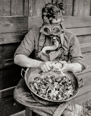 Travel back in time to 1917 and witness the ingenious antics of a clever soldier at Camp Kearny, California, as he tackles the age-old problem of tear-inducing onions. This entertaining photograph captures the soldier's comical solution to keep the tears at bay. With a dash of creativity and a hint of hilarity, this image serves as a delightful reminder that even in the midst of duty, humor finds its way into the hearts of soldiers. Prepare to chuckle and appreciate the resourcefulness of our brave servicemen from days gone by.