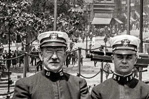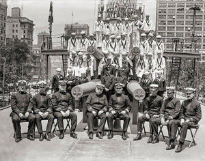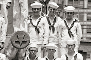 Presenting an extraordinary group photograph of the sailors from the USS ship Recruit, taken around 1910 on a rooftop in the city. This image showcases a diverse gathering of sailors, representing all ranks, with higher-ranking officials seated prominently. Thiis photo shows the rich maritime history as you delve into the expressions and uniforms that epitomize the camaraderie and professionalism of these naval servicemen. The photograph tells a tale of the palpable pride emanating from their faces. Whether you possess a deep fascination for history, a keen interest in naval affairs, or a curiosity about early 20th-century culture, this remarkable group shot is an enthralling piece that breathes life into the USS ship Recruit and its devoted crew.