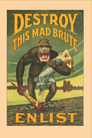 A striking propaganda poster from 1918 depicts a powerful image designed to convey a message. In this illustration, a formidable gorilla adorned with a helmet labeled "militarism" wields a blood-stained club labeled "kultur." In a symbolic representation, the gorilla, while advancing onto the shores of America, holds a half-naked woman captive.
