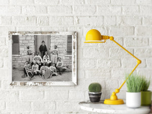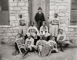 Very early photo of African American baseball players from Morris Brown College, with a boy and another older man standing near the door, Atlanta, Georgia. Taken 1900. The college was founded on January 5, 1881 as the Morris Brown Colored College.