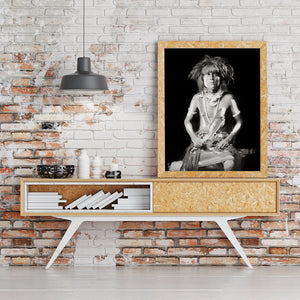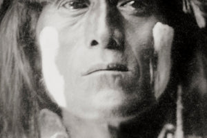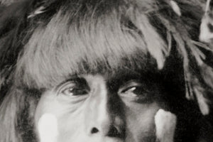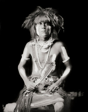 This captivating photograph taken by Edward Curtis in 1899 features an esteemed Hopi Snake Priest. The priest is depicted in a 3/4 length portrait, seated with body and facial paint. Adorned with striking beads made of shells and bones, his attire reflects the cultural significance and symbolism of the Hopi tradition. In his right hand, he holds a feather, a sacred object embodying spiritual significance. The image offers a glimpse into the sacred rituals and deep spiritual connection of the Hopi people, beautifully captured by Edward Curtis' lens.
