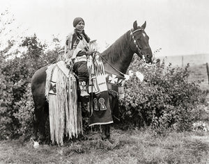 Time travel to the early 1900s and witness the timeless beauty and grace of a Cayuse woman on horseback in this captivating photograph by Edward Curtis. Dressed in a meticulously crafted beaded buckskin dress, she exudes a sense of pride and connection to her heritage. The intricate details of her attire, from the delicate beadwork to the elegant horse blanket adorned with long fringe and beaded trappings, reflect the rich artistic traditions of her culture.