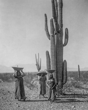 In this evocative photograph captured by Edward Curtis in 1905, we are transported to the world of the Maricopa women as three of them engage in the age-old practice of gathering fruit from the majestic Saguaro Cactus. The towering presence of the cactus serves as a testament to the desert landscape that surrounds them. With a deep sense of connection to their ancestral traditions, these women skillfully collect the nourishing bounty offered by nature. Curtis's artistry and keen eye for detail allow us to appreciate the harmonious relationship between the Maricopa people and their natural environment. Through this timeless image, we are invited to admire the resourcefulness and cultural heritage of the Maricopa women as they partake in this essential task of sustenance.