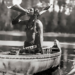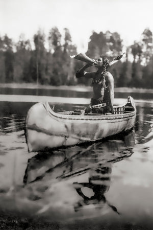In 1908, Roland Reed captured a photograph titled "The Moose Call." The image depicts an Ojibwe individual peacefully seated in a canoe on a serene lake. Engaged in a unique practice, the Ojibwe man blows into a skin or bark, producing a distinct sound. His appearance showcases a shirtless attire, adorned with braids and a feather accentuating his hair. The purpose behind his call remains ambiguous: whether it serves as a means of communication with others or an attempt to allure an animal for sustenance is open to interpretation. Nevertheless, the tranquil backdrop of the placid lake enhances the sense of harmony and tranquility conveyed by the photograph.