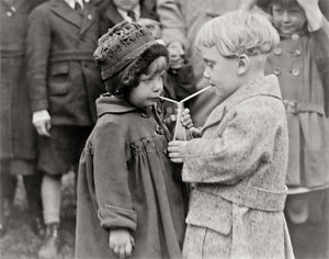 Capture the innocence and joy of childhood with this heartwarming photograph taken in 1922. In this delightful image, a little boy and girl share a special moment as they sip from a shared bottle of soda, each with their own straw. The simple pleasure of enjoying a refreshing drink together radiates from their faces, reflecting the carefree spirit of youth. This nostalgic snapshot encapsulates a time of innocence and genuine connection. Transport yourself to a bygone era and embrace the purity of childhood friendships with this enchanting photograph. Whether as a treasured keepsake or a charming addition to your vintage collection, this timeless image will evoke smiles and warm memories for years to come.