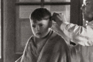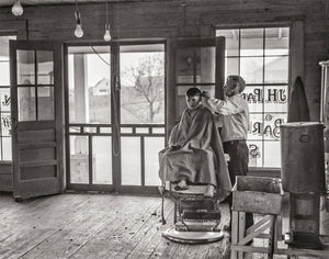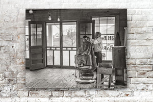 The scene unfolds in a rustic barber shop, where a young boy sits in an antique barber chair, getting his haircut. The ambiance is further enhanced by the presence of a charming wood floor, adding warmth and authenticity to the setting. Through the double screen doors, gentle sunlight filters in, casting a soft glow on the boy and the surrounding space. It creates an atmosphere that is both nostalgic and timeless, inviting you to immerse yourself in the rich history and traditions of small-town America.