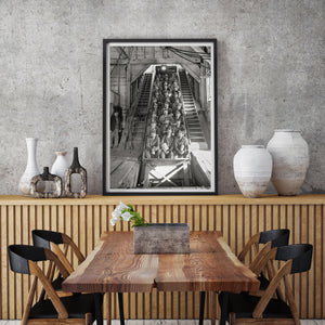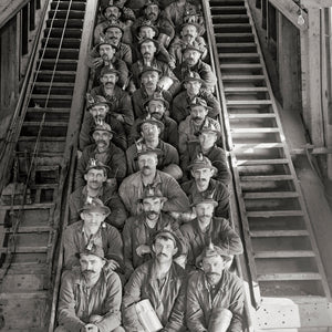 Capture a piece of history with this remarkable photograph from 1906. Featuring a group of 29 coal miners sitting inside a conveyor, with an attentive operator standing nearby, this image provides a fascinating glimpse into the challenging world of coal mining in Michigan. The labor-intensive work of these miners is evident as they hold onto their lunch buckets waiting to go into the mines. A perfect addition to any collection or a thoughtful gift for history enthusiasts.