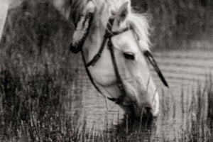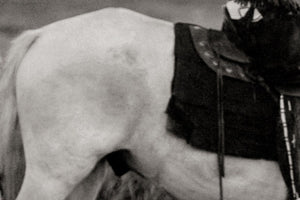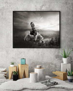 Transport yourself to the majestic Badlands with this vintage portrait taken by renowned photographer Edward Curtis in the early 1900s. The image portrays a beautiful scene—a proud Oglala Warrior Indian adorned in a magnificent headdress, seated gracefully on a majestic white horse, quenching his thirst from a natural water source.