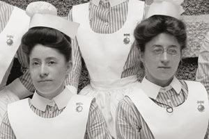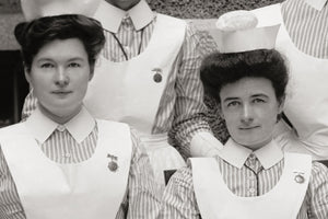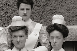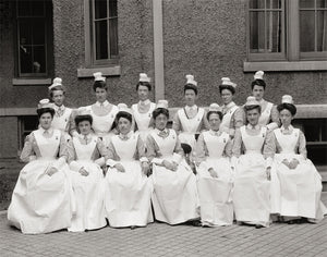 This intriguing group photo was captured at Providence Rhode Island Hospital around 1930. Thirteen dedicated nurses come together in this snapshot, forming two rows. The nurses exude a sense of composure and confidence. Adorned in their pristine uniforms, complete with iconic white hats, these healthcare professionals display their commitment to their noble profession of nursing. Their expressions vary from radiant smiles to a more serious demeanor, revealing the diverse personalities and experiences within the group. This captivating image immortalizes a moment in the history of nursing.