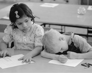 In this delightful image, a third-grader, possibly fatigued from inadequate sleep or feeling exceptionally bored, is seen resting his head on his arm. We can empathize with this familiar sight, as teachers of all grade levels often encounter these  students. By his side, another young girl gazes inquisitively, perhaps curious about the situation unfolding before her. This candid snapshot reminds us of the universal experiences shared by educators, regardless of their students' ages. It serves as a lighthearted reminder of the varied dynamics within a classroom and the amusing moments that make teaching such an enriching and memorable journey.