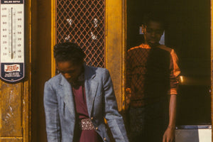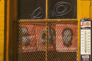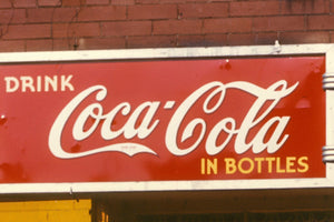 Enter a scene frozen in time at Shulman's Market in 1942, Washington DC. In this poignant photograph, a pouty little girl sits before us, adorned in a vibrant red dress that beautifully matches the bright red Coca-Cola sign above. The "golden hour" bathes the scene in a warm, glowing light, emphasizing the radiance of her dress and the vibrant yellow-painted bricks of Shulman's Market.