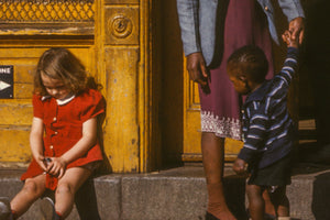 Amidst this backdrop, we see a little black boy looking intently at the pouty girl. Concern and curiosity etch his face as his mother engages in conversation with him. Their presence adds depth and emotion to the image, evoking a sense of connection and shared humanity despite the societal challenges of the time.