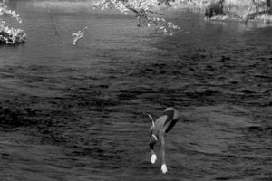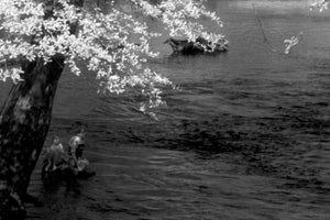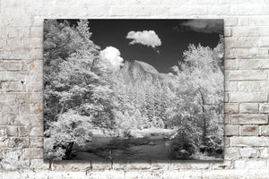 In this remarkable photograph of Yosemite Valley, the ethereal quality of infrared photography transforms the scene, lending an otherworldly charm to the iconic landscape. As the sun shines down on a hot day, people can be seen wading in the refreshing waters, finding respite and enjoyment amidst the natural splendor.
