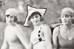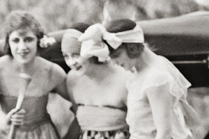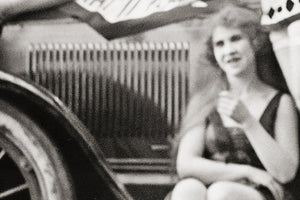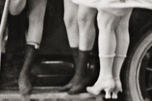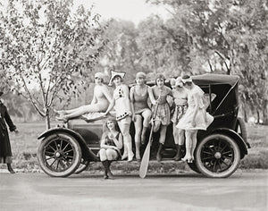 Step back in time to the playful and carefree spirit of the 1920s with this delightful photograph. Seven girls, adorned in charming costumes, are captured in a moment of pure joy and merriment. Six girls are on the car's running board, wth one on the hood embodies the vibrant energy and sense of adventure that defined the era. This cute photo transports you to a bygone era, where fun and imagination knew no bounds. A perfect addition to any collection, this photograph is sure to bring a smile to your face and evoke a sense of nostalgia for the carefree days of the past.