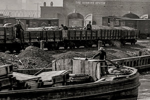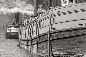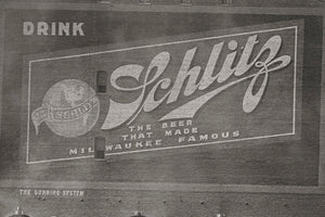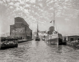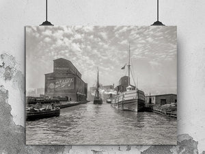 This vintage photograph showcases the iconic Chicago River elevators in 1900. The image transports you to a bustling cityscape where steamships navigate the waters, while the prominent Schlitz advertisement on the building adds a touch of historic charm. Experience the vibrant energy of Chicago's industrial era as the riverfront comes alive with activity. This captivating photo not only celebrates the city's architectural heritage but also offers a glimpse into the advertising and transportation of the time.