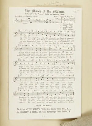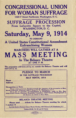 On May 2, 1914, nationwide demonstrations resonated in support of this crucial Amendment (see advertisement of the march below, not for sale). Dedicated envoys from these demonstrations arrived in Washington on May 9th, carrying with them a multitude of petitions. They embarked on a solemn procession from Lafayette Square, making their way to Congress. Along the way, the entourage, numbering in the thousands, converged on and around the East Steps of the Capitol. As they gathered, their voices harmonized in a powerful chorus, singing "The March of the Women." This inspiring anthem, composed by Ethel Smyth in 1910, featured stirring lyrics penned by Cicely Hamilton (see below for lyrics, not for sale).