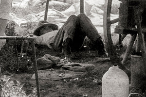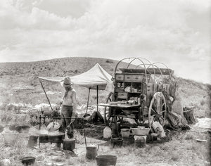 A cowboy and his sleeping friend with their Chuck Wagon (the first food cart), cooking up some grub. 1908.