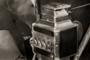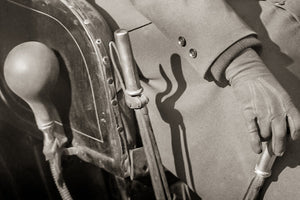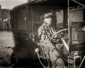 In this photograph, the pioneering Wilma Russey proudly poses inside her vehicle, embodying the determination and courage that characterized women who challenged societal barriers. As you take in the image, you can't help but notice the unique horn.