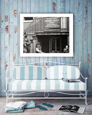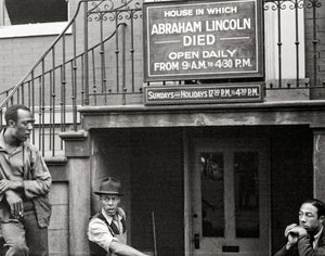 Step into a poignant moment in history with this captivating vintage photograph. Taken in 1937, it showcases a group of Black men finding respite on the stairs of the home where Abraham Lincoln tragically passed away.